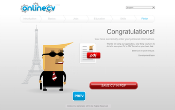 Paso a paso y de forma amena, Online CV generator te irá pidiendo información para ir llenando tu currículum. Datos personales, vida profesional y académica, idiomas... Online CV generator reunirá los datos y los transformará en un vistoso documentos en PDF.